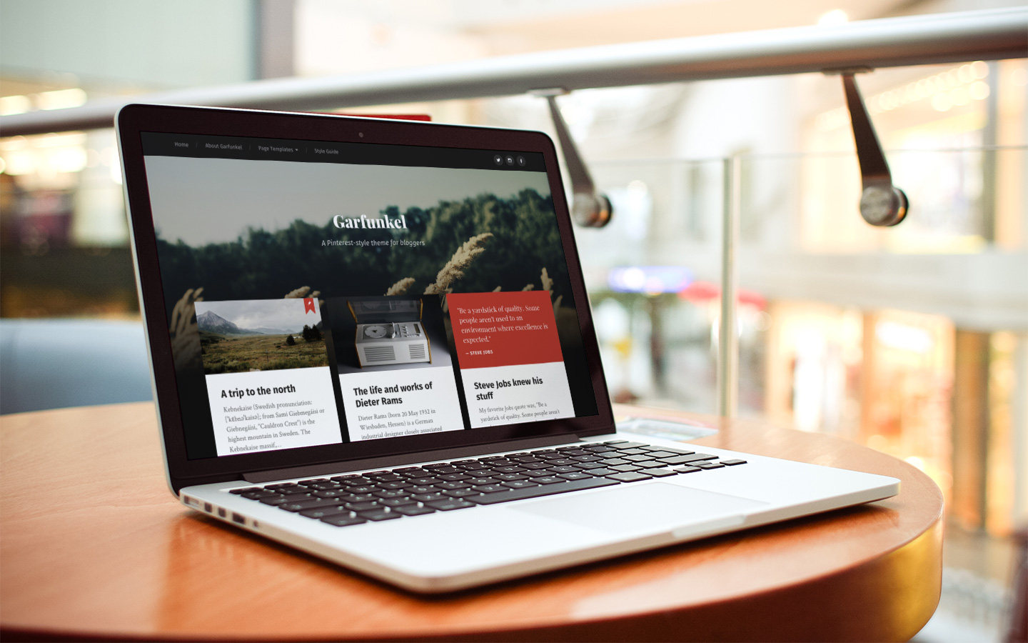 Garfunkel is a stylish and responsive Pinterest-style theme with Masonry layout. It features responsive and retina-ready design, support for six post formats (including a gallery slideshow), six custom widgets, two page templates, Jetpack Infinite Scroll support, editor styling and translation-ready code.